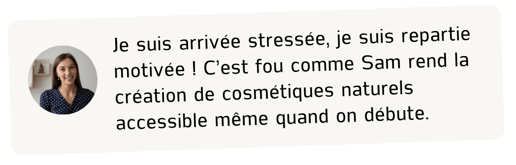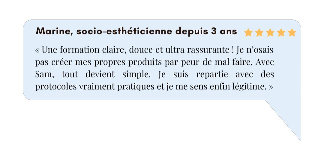 « Formation complète, riche, mais jamais lourde. Sam a une énergie douce qui donne confiance. J’ai adoré manipuler, tester, créer… J’ai déjà intégré 3 recettes dans mes soins individuels. » Laurie, socio-esthéticienne indépendante